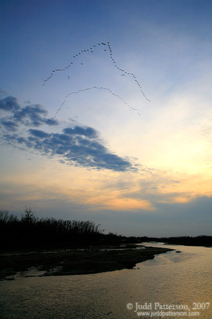 cranes flying to safe roosting spots in the river.