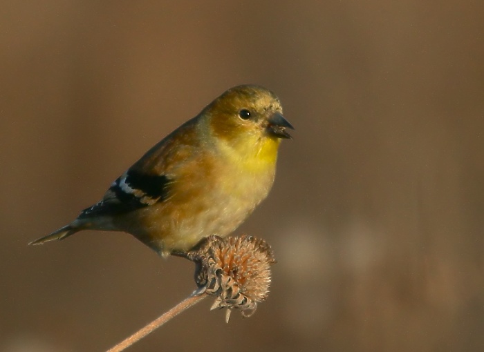 Recently we've had unseasonably warm weather (some parts of Kansas were over 70 degrees). This winter plumage American Goldfinch was taking advantage of the good weather to feed on some remaining seeds